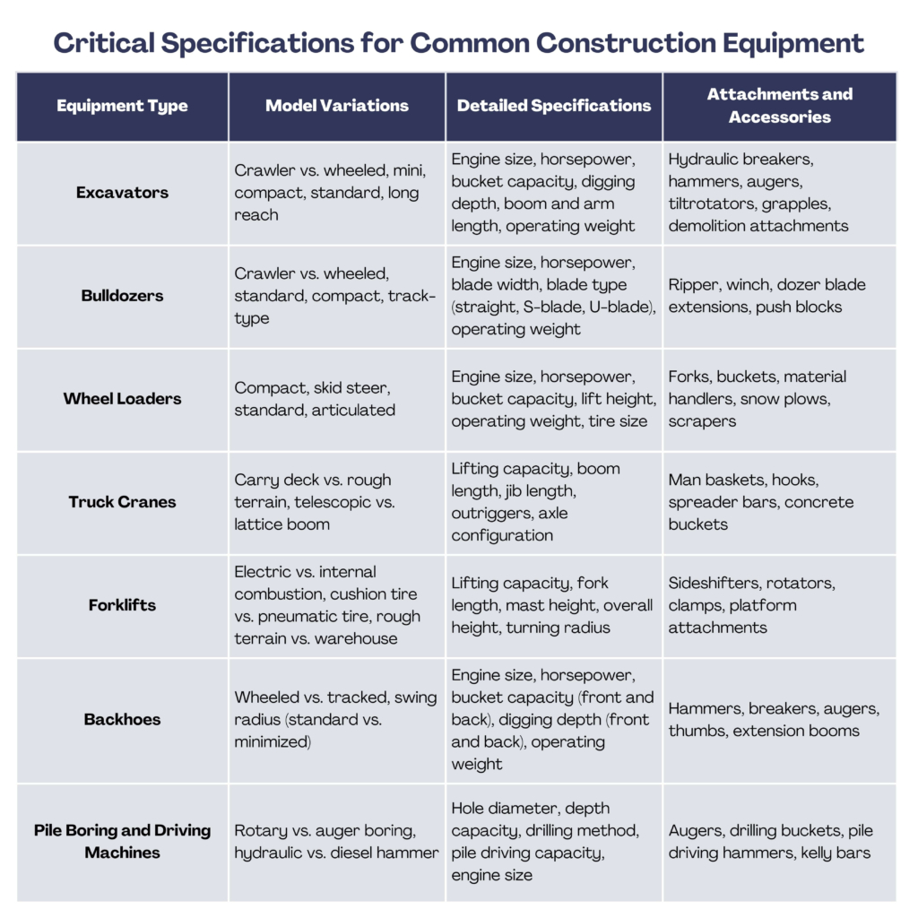 The following table outlines critical specifications and features for common construction equipment. Keep in mind that while this information is a valuable starting point, a thorough equipment appraisal should always consider factors such as age, condition, hours of operation, and market conditions.