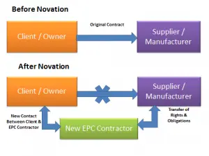 Innovation process, we discharge the original contract between the Owner & Supplier / Manufacturer and substitute it with a new contract between the Supplier / Manufacturer and a new incoming party (EPC Contractor). The incoming party (EPC Contractor) must perform the contractual obligations (under the new contract) that were formerly owned by the outgoing party (Owner) under the original contract.